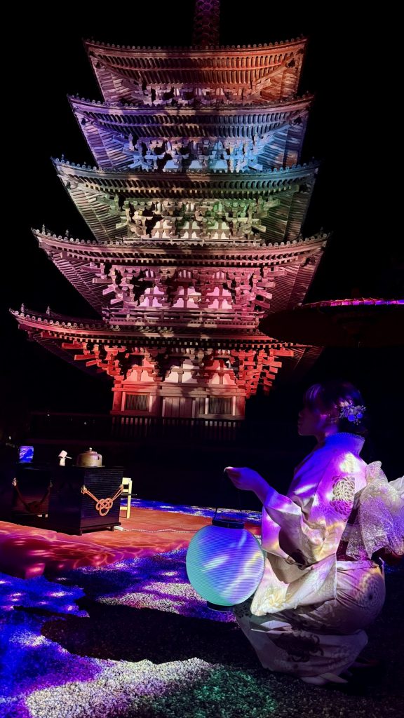 国宝「五重塔」の前では、立礼による茶道とネイキッドによるアートテクノロジーを融合させた、特別な呈茶席を設けられています。