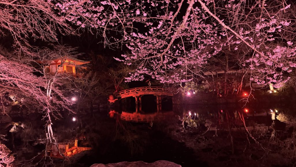 弁天池には、ライトアップされた弁天堂や桜が映り込みます。