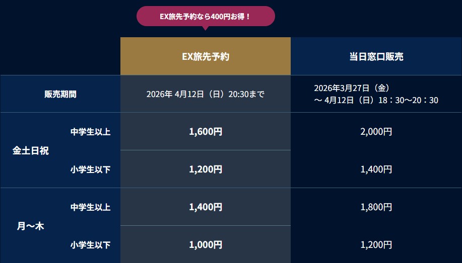 チケット 当日窓口販売価格 月~木:大人1,800円、金土日祝:大人2,200円